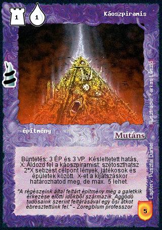 Szöveg: Büntetés: 3 ÉP és 3 VP. Késleltetett hatás, X: Áldozd fel a káoszpiramist: szétoszthatsz 2*X sebzést célpont lények, játékosok és épületek között. X-et a kijátszáskor határozhatod meg, de max. 5 lehet.