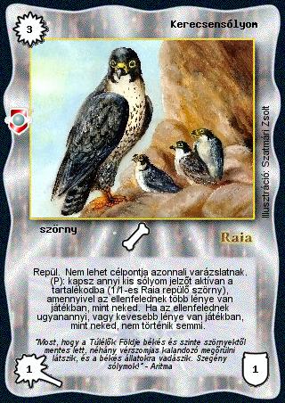 Szöveg: Repül. Nem lehet célpontja azonnali varázslatnak. (P): kapsz annyi kis sólyom jelzőt aktívan a tartalékodba (1/1-es Raia repülő szörny), amennyivel az ellenfelednek több lénye van játékban, mint neked. Ha az ellenfelednek ugyanannyi, vagy kevesebb lénye van játékban, mint neked, nem történik semmi.