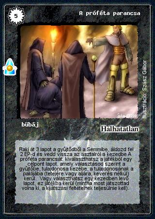 Szöveg: Rakj át 3 lapot a gyűjtődből a Semmibe, áldozd fel 2 ÉP-d és vedd vissza az asztalról a kezedbe A próféta parancsát: kiválaszthatsz a játékból egy célpont lapot, amely választásod szerint a gyűjtőbe, tulajdonosa kezébe, a tulajdonosának a paklijába (tetejére vagy aljára, keverés nélkül) kerül. Vagy választhatsz egy kezedben levő lapot, ez játékba kerül (mintha most játszottad volna ki, a kijátszási feltételnek teljesülnie kell).