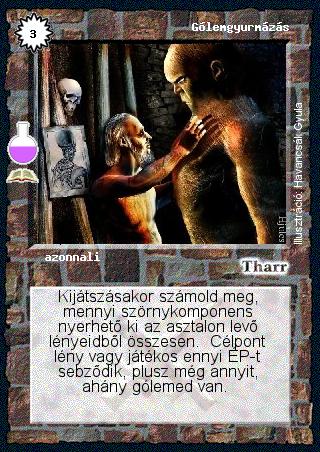 Szöveg: Kijátszásakor számold meg, mennyi szörnykomponens nyerhető ki az asztalon levő lényeidből összesen. Célpont lény vagy játékos ennyi ÉP-t sebződik, plusz még annyit, ahány gólemed van.