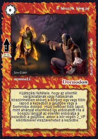 Szöveg: Kijátszási feltétele, hogy az ellenfél varázslatának vagy hatásának köszönhetően ebben a körben egy vagy több lapod a kezedből a gyűjtőbe vagy a Semmibe dobtad. Húzz kettővel több lapot, mint ahányat ellenfeled így eldobatott! Ha a bosszú lángját az ellenfél eldobatja a kezedből a gyűjtőbe, akkor a kör végén 2 VP elköltésével visszaveheted a kezedbe.