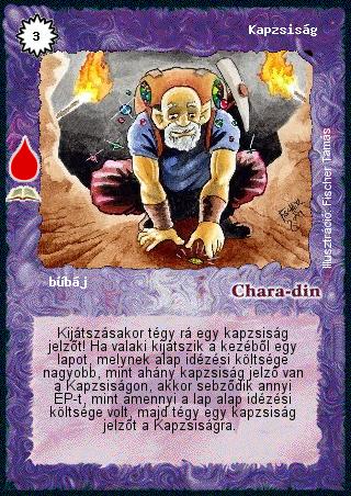 Szöveg: Kijátszásakor tégy rá egy kapzsiság jelzőt! Ha valaki kijátszik a kezéből egy lapot, melynek alap idézési költsége nagyobb, mint ahány kapzsiság jelző van a Kapzsiságon, akkor sebződik annyi ÉP-t, mint amennyi a lap alap idézési költsége volt, majd tégy egy kapzsiság jelzőt a Kapzsiságra.