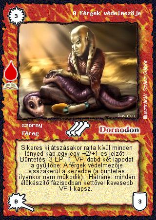 Szöveg: Sikeres kijátszásakor rajta kívül minden lényed kap egy-egy +2/+1-es jelzőt. Büntetés: 3 ÉP. 1 VP, dobd két lapodat a gyűjtőbe: A férgek védelmezője visszakerül a kezedbe (a büntetés ilyenkor nem működik). Hátrány: minden előkészítő fázisodban kettővel kevesebb VP-t kapsz.