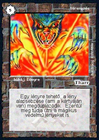 Szöveg: Egy lényre tehető, a lény alapsebzése (ami a kártyáján van) megduplázódik. Ezentúl meg tudja ütni a mágikus védelmű lényeket is.
