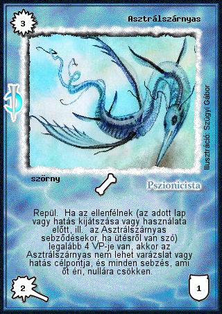 Szöveg: Repül. Ha az ellenfélnek (az adott lap vagy hatás kijátszása vagy használata előtt, ill. az Asztrálszárnyas sebződésekor, ha ütésről van szó) legalább 4 VP-je van, akkor az Asztrálszárnyas nem lehet varázslat vagy hatás célpontja, és minden sebzés, ami őt éri, nullára csökken.