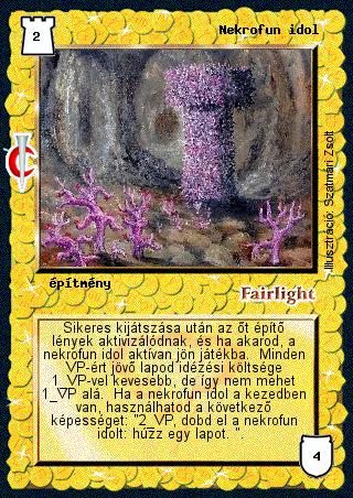 Szöveg: Sikeres kijátszása után az őt építő lények aktivizálódnak, és ha akarod, a nekrofun idol aktívan jön játékba. Minden VP-ért jövő lapod idézési költsége 1 VP-vel kevesebb, de így nem mehet 1 VP alá. Ha a nekrofun idol a kezedben van, használhatod a következő képességet: "2 VP, dobd el a nekrofun idolt: húzz egy lapot. ".