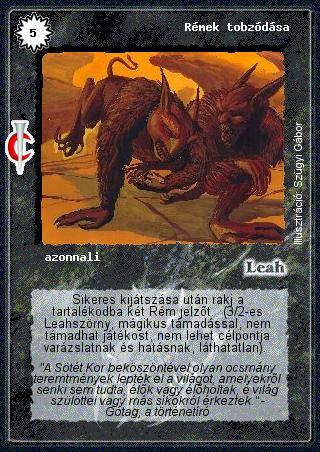 Szöveg: Sikeres kijátszása után rakj a tartalékodba két Rém jelzőt. (3/2-es Leahszörny, mágikus támadással, nem támadhat játékost, nem lehet célpontja varázslatnak és hatásnak, láthatatlan).