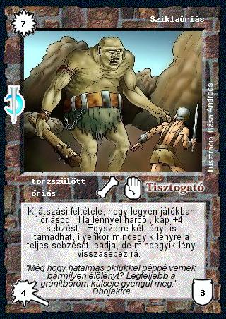 Szöveg: Kijátszási feltétele, hogy legyen játékban óriásod. Ha lénnyel harcol, kap +4 sebzést. Egyszerre két lényt is támadhat, ilyenkor mindegyik lényre a teljes sebzését leadja, de mindegyik lény visszasebez rá.