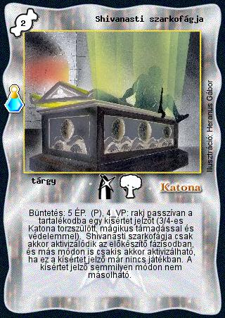 Szöveg: Büntetés: 5 ÉP. (P), 4 VP: rakj passzívan a tartalékodba egy kísértet jelzőt (3/4-es Katona torzszülött, mágikus támadással és védelemmel). Shivanasti szarkofágja csak akkor aktivizálódik az előkészítő fázisodban, és más módon is csakis akkor aktivizálható, ha ez a kísértet jelző már nincs játékban. A kísértet jelző semmilyen módon nem másolható.