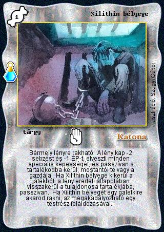Szöveg: Bármely lényre rakható. A lény kap -2 sebzést és -1 ÉP-t, elveszti minden speciális képességét, és passzívan a tartalékodba kerül, mostantól te vagy a gazdája. Ha Xilithin bélyege kikerül a játékból, a lény eredeti állapotában visszakerül a tulajdonosa tartalékjába, passzívan. Ha Xilithin bélyegét egy galetkire akarod rakni, az megakadályozható egy testrész feláldozásával.