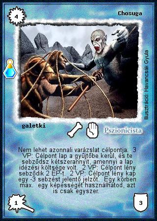 Szöveg: Nem lehet azonnali varázslat célpontja. 3 VP: Célpont lap a gyűjtőbe kerül, és te sebződsz kétszerannyit, amennyi a lap idézési költsége volt. 2 VP: Célpont lény sebződik 2 ÉP-t. 2 VP: Célpont lény kap egy -3 sebzést jelentő jelzőt. Egy körben max. egy képességét használhatod, azt is csak egyszer.