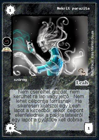 Szöveg: Nem cserélhet gazdát, nem kerülhet rá lap vagy jelző. Nem lehet célpontja forrásnak. Ha sikeresen kijátszol egy Leah lapot a kezedből, akkor célpont ellenfelednek a paklija tetejéről egy lapot a gyűjtőbe kell dobnia.