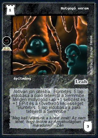 Szöveg: Aktívan jön játékba. Büntetés: 5 lap eldobása a pakli tetejéről a Semmibe. Minden motyogód kap +1 sebzést és +1 ÉP-t és a következő képességet: "Büntetés: 5 lap eldobása a pakli tetejéről a Semmibe."