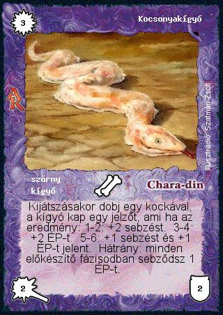 Szöveg: Kijátszásakor dobj egy kockával, a kígyó kap egy jelzőt, ami ha az eredmény: 1-2: +2 sebzést. 3-4: +2 ÉP-t. 5-6: +1 sebzést és +1 ÉP-t jelent. Hátrány: minden előkészítő fázisodban sebződsz 1 ÉP-t.