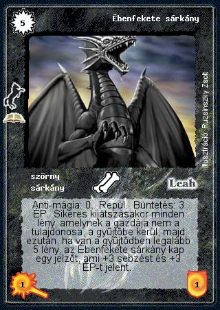 Szöveg: Anti-mágia: 0. Repül. Büntetés: 3 ÉP. Sikeres kijátszásakor minden lény, amelynek a gazdája nem a tulajdonosa, a gyűjtőbe kerül, majd ezután, ha van a gyűjtődben legalább 5 lény, az Ébenfekete sárkány kap egy jelzőt, ami +3 sebzést és +3 ÉP-t jelent.