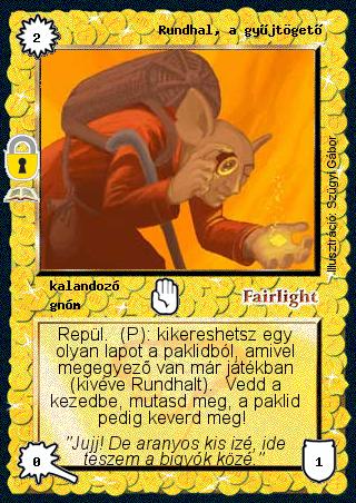 Szöveg: Repül. (P): kikereshetsz egy olyan lapot a paklidból, amivel megegyező van már játékban (kivéve Rundhalt). Vedd a kezedbe, mutasd meg, a paklid pedig keverd meg!