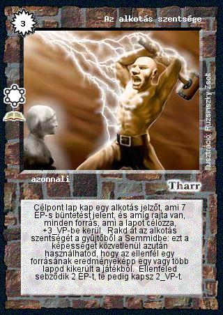 Szöveg: Célpont lap kap egy alkotás jelzőt, ami 7 ÉP-s büntetést jelent, és amíg rajta van, minden forrás, ami a lapot célozza, +3 VP-be kerül. Rakd át az alkotás szentségét a gyűjtőből a Semmidbe: ezt a képességet közvetlenül azután használhatod, hogy az ellenfél egy forrásának eredményeképp egy vagy több lapod kikerült a játékból. Ellenfeled sebződik 2 ÉP-t, te pedig kapsz 2 VP-t.