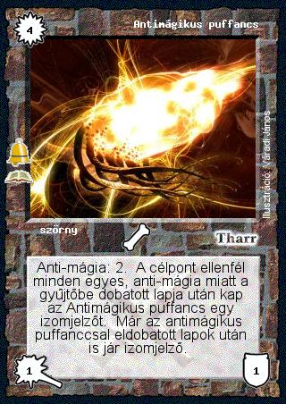 Szöveg: Anti-mágia: 2. A célpont ellenfél minden egyes, anti-mágia miatt a gyűjtőbe dobatott lapja után kap az Antimágikus puffancs egy izomjelzőt. Már az antimágikus puffanccsal eldobatott lapok után is jár izomjelző.