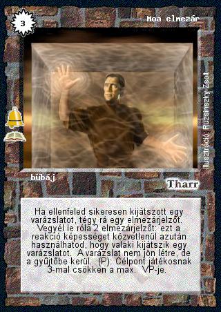 Szöveg: Ha ellenfeled sikeresen kijátszott egy varázslatot, tégy rá egy elmezárjelzőt. Vegyél le róla 2 elmezárjelzőt: ezt a reakció képességet közvetlenül azután használhatod, hogy valaki kijátszik egy varázslatot. A varázslat nem jön létre, de a gyűjtőbe kerül. (P): Célpont játékosnak 3-mal csökken a max. VP-je.