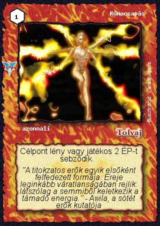 Kiadás: Káoszkatlan Gyakoriság: gyakori Lapszín (isten): Tolvaj Klán Típus: azonnali Szöveg: Célpont lény vagy játékos 2 ÉP-t sebződik. Szinesítő szöveg: "A titokzatos erők egyik elsőként felfedezett formája. Ereje leginkább váratlanságában rejlik: látszólag a semmiből keletkezik a támadó energia." - Awila, a sötét erők kutatója Illusztráció: Váradi János