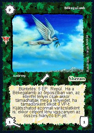 Szöveg: Büntetés: 5 ÉP. Repül. Ha a Békegalamb az őrposztban van, az ellenfél lényei csak akkor támadhatják meg a lényeidet, ha támadónként elkölt 3 VP-t. Kijátszhatod azonnali varázslatként is; ekkor célpont lény visszanyeri az összes hiányzó ÉP-jét.