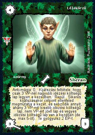Szöveg: Anti-mágia: 0. Kijátszási feltétele, hogy csak 3 VP-nél nagyobb idézési költségű lap legyen a kezedben. Repül. Sikeres kijátszásakor célpont ellenfeled megmutatja a kezét, és sebződik annyit, ahány 3 VP-nél kisebb idézési költségű lap, nem VP-ért jövő lap és vegyes idézési költségű lap van a kezében (de max 5-öt). Te gyógyulsz 2 ÉP-t.