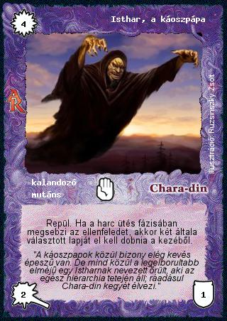 Kiadás: Alanori Krónika Gyakoriság: ritka Lapszín (isten): Chara-din Típus: kalandozó Altípus: mutáns Szöveg: Repül. Ha a harc ütés fázisában megsebzi az ellenfeledet, akkor két általa választott lapját el kell dobnia a kezéből. Szinesítő szöveg: "A káoszpapok közül bizony elég kevés épeszű van. De mind közül a legelborultabb elméjű egy Istharnak nevezett őrült, aki az egész hierarchia tetején áll; ráadásul Chara-din kegyét élvezi." Illusztráció: Ruzsinszki Zsolt