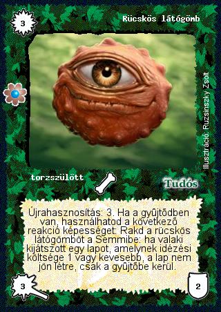 Szöveg: Újrahasznosítás: 3. Ha a gyűjtődben van, használhatod a következő reakció képességet: Rakd a rücskös látógömböt a Semmibe: ha valaki kijátszott egy lapot, amelynek idézési költsége 1 vagy kevesebb, a lap nem jön létre, csak a gyűjtőbe kerül.