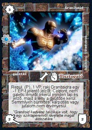 Kiadás: Rhatt fénykora Gyakoriság: nem gyakori Lapszín (isten): Tisztogató Klán Típus: galetki Szöveg: Repül. (P), 1 VP, rakj Granitoidra egy -1 ÉP-t jelentő jelzőt: Célpont, nem galetki lényről lekerül minden lap és jelző, majd a lény a gyűjtőbe kerül. Semmilyen büntetés, kárpótlás vagy jutalom nem érvényesül. Szinesítő szöveg: "Granitoid kedvenc taktikája volt, hogy egy sziklaperemről rávetette magát áldozatára." Illusztráció: Váradi János