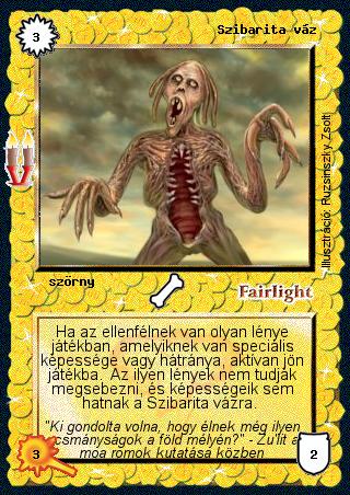 Kiadás: Régmúlt, Alappakli, 8. kiadás, Alappakli, 9. kiadás (Végzetúr) Gyakoriság: gyakori Lapszín (isten): Fairlight Típus: szörny Szöveg: Ha az ellenfélnek van olyan lénye játékban, amelyiknek van speciális képessége vagy hátránya, aktívan jön játékba. Az ilyen lények nem tudják megsebezni, és képességeik sem hatnak a Szibarita vázra. Szinesítő szöveg: "Ki gondolta volna, hogy élnek még ilyen ocsmányságok a föld mélyén?" - Zu'lit a moa romok kutatása közben Illusztráció: Ruzsinszki Zsolt