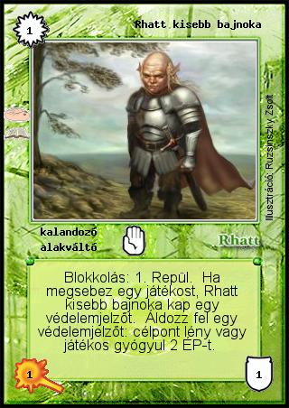 Szöveg: Blokkolás: 1. Repül. Ha megsebez egy játékost, Rhatt kisebb bajnoka kap egy védelemjelzőt. Áldozz fel egy védelemjelzőt: célpont lény vagy játékos gyógyul 2 ÉP-t.