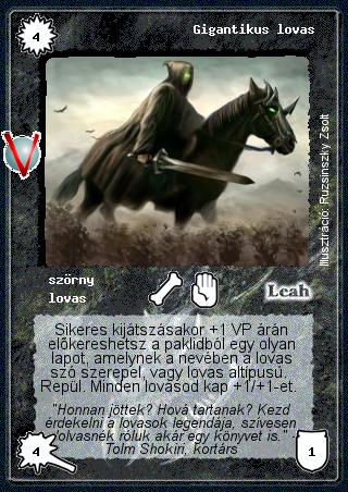 Szöveg: Sikeres kijátszásakor +1 VP árán előkereshetsz a paklidból egy olyan lapot, amelynek a nevében a lovas szó szerepel, vagy lovas altípusú. Repül. Minden lovasod kap +1/+1-et.