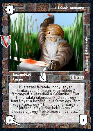 Szöveg: Kijátszási feltétele, hogy legyen fémtárgyad játékban, vagy eldobj 2 fémtárgyat a kezedből a Semmibe. Élet: 1. Ha valaki sikeresen kijátszott egy fémtárgyat a kezéből, húzhatsz egy lapot vagy kapsz egy *-t. Ha egy fémtárgy a játékból a gyűjtőbe kerül (kivéve áldozástól), egy * elköltésével húzhatsz 1 lapot.