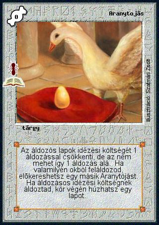 Szöveg: Az áldozós lapok idézési költségét 1 áldozással csökkenti, de az nem mehet így 1 áldozás alá. Ha valamilyen okból feláldozod, előkereshetsz egy másik Aranytojást. Ha áldozásos idézési költségnek áldoztad, kör végén húzhatsz egy lapot.