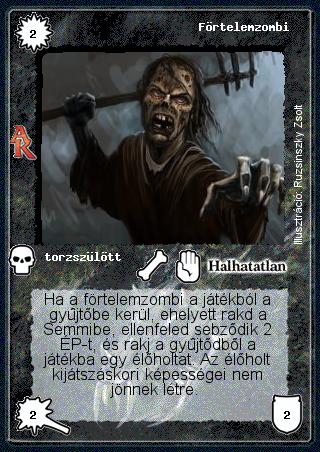 Kiadás: Alanori Krónika Gyakoriság: ritka Lapszín (isten): Halhatatlan Klán Típus: torzszülött Szöveg: Ha a förtelemzombi a játékból a gyűjtőbe kerül, ehelyett rakd a Semmibe, ellenfeled sebződik 2 ÉP-t, és rakj a gyűjtődből a játékba egy élőholtat. Az élőholt kijátszáskori képességei nem jönnek létre. Illusztráció: Ruzsinszki Zsolt