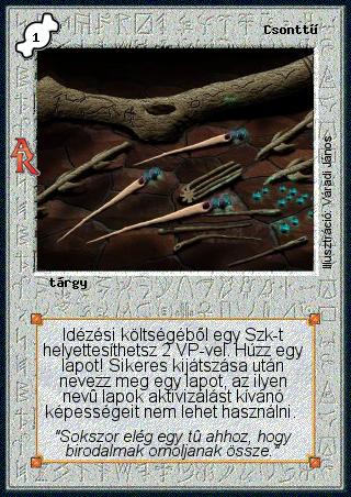 Kiadás: Alanori Krónika Gyakoriság: ritka Lapszín (isten): Színtelen Típus: tárgy Szöveg: Idézési költségéből egy Szk-t helyettesíthetsz 2 VP-vel. Húzz egy lapot! Sikeres kijátszása után nevezz meg egy lapot, az ilyen nevű lapok aktivizálást kívánó képességeit nem lehet használni. Szinesítő szöveg: "Sokszor elég egy tű ahhoz, hogy birodalmak omoljanak össze." Illusztráció: Váradi János
