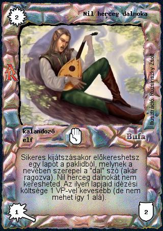 Kiadás: Alanori Krónika Gyakoriság: ritka Lapszín (isten): Bufa Típus: kalandozó Altípus: elf Szöveg: Sikeres kijátszásakor előkereshetsz egy lapot a paklidból, melynek a nevében szerepel a "dal" szó (akár ragozva). Nil herceg dalnokát nem keresheted. Az ilyen lapjaid idézési költsége 1 VP-vel kevesebb (de nem mehet így 1 alá). Illusztráció: Ruzsinszki Zsolt