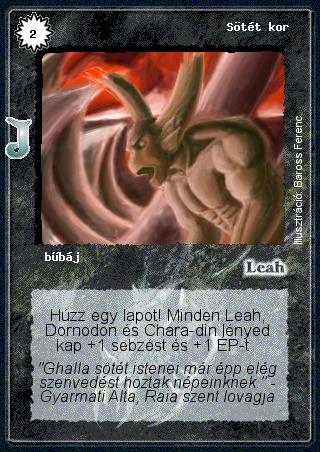 Szöveg: Húzz egy lapot! Minden Leah, Dornodon és Chara-din lényed kap +1 sebzést és +1 ÉP-t.