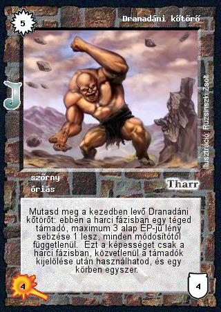 Szöveg: Mutasd meg a kezedben levő Dranadáni kőtörőt: ebben a harci fázisban egy téged támadó, maximum 3 alap ÉP-jű lény sebzése 1 lesz, minden módosítótól függetlenül. Ezt a képességet csak a harci fázisban, közvetlenül a támadók kijelölése után használhatod, és egy körben egyszer.
