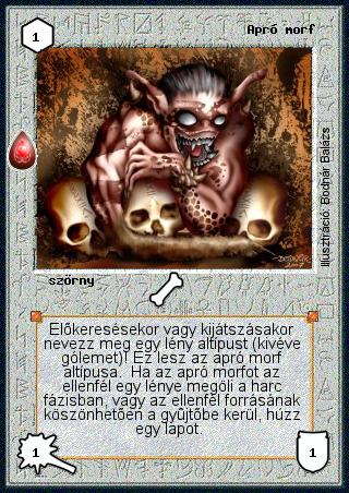 Szöveg: Előkeresésekor vagy kijátszásakor nevezz meg egy lény altípust (kivéve gólemet)! Ez lesz az apró morf altípusa. Ha az apró morfot az ellenfél egy lénye megöli a harc fázisban, vagy az ellenfél forrásának köszönhetően a gyűjtőbe kerül, húzz egy lapot.