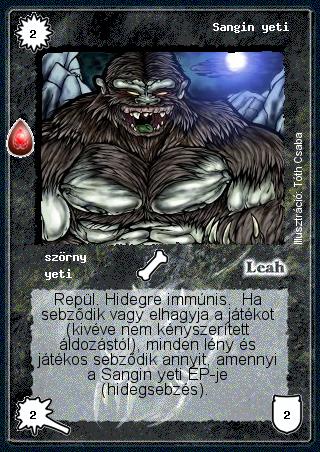 Szöveg: Repül. Hidegre immúnis. Ha sebződik vagy elhagyja a játékot (kivéve nem kényszerített áldozástól), minden lény és játékos sebződik annyit, amennyi a Sangin yeti ÉP-je (hidegsebzés).