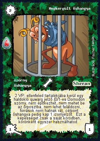 Szöveg: 2 VP: ellenfeled tartalékjába kerül egy haldokló quwarg jelző (0/1-es Dornodon szörny, nem építkezhet, nem mehet be az őrposztba, nem lehet feláldozni, források nem hatnak rá), célpont őshangya pedig kap 1 izomjelzőt. Ezt a képességet csak a saját körödben, körönként egyszer használhatod.