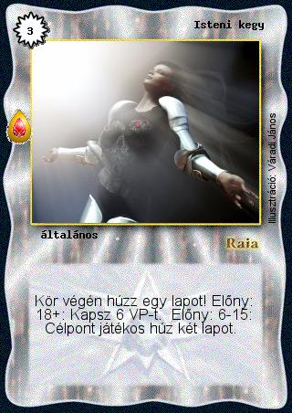 Kiadás: Zu'lit kincse Gyakoriság: ritka Lapszín (isten): Raia Típus: általános Szöveg: Kör végén húzz egy lapot! Előny: 18+: Kapsz 6 VP-t. Előny: 6-15: Célpont játékos húz két lapot. Illusztráció: Váradi János