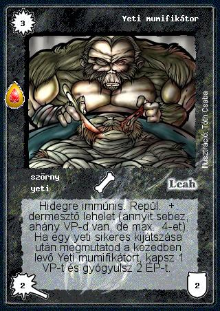 Szöveg: Hidegre immúnis. Repül. +: dermesztő lehelet (annyit sebez, ahány VP-d van, de max. 4-et). Ha egy yeti sikeres kijátszása után megmutatod a kezedben levő Yeti mumifikátort, kapsz 1 VP-t és gyógyulsz 2 ÉP-t.