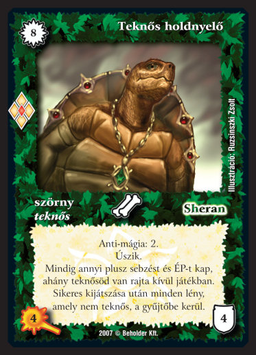 Szöveg: Anti-mágia: 2. Úszik. Mindig annyi plusz sebzést és ÉP-t kap, ahány teknősöd van rajta kívül játékban. Sikeres kijátszása után minden lény, amely nem teknős, a gyűjtőbe kerül.