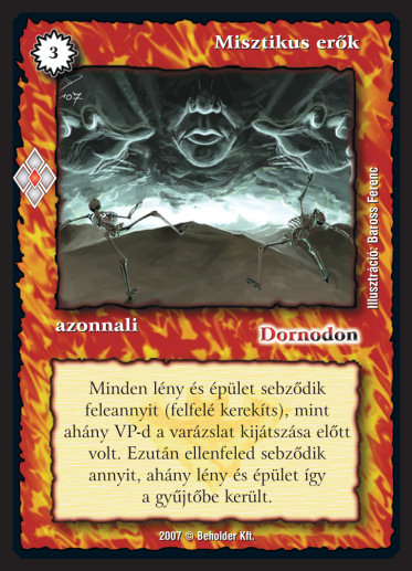 Szöveg: Minden lény és épület sebződik feleannyit (felfelé kerekíts), mint ahány VP-d a varázslat kijátszása előtt volt. Ezután ellenfeled sebződik annyit, ahány lény és épület így a gyűjtőbe került.