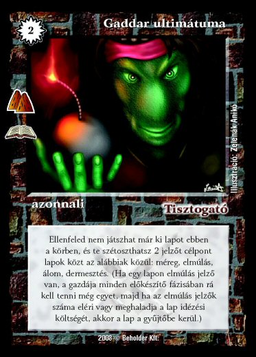 Szöveg: Ellenfeled nem játszhat már ki lapot ebben a körben, és te szétoszthatsz 2 jelzőt célpont lapok közt az alábbiak közül: méreg, elmúlás, álom, dermesztés. (Ha egy lapon elmúlás jelző van, a gazdája minden előkészítő fázisában rá kell tenni még egyet, majd ha az elmúlás jelzők száma eléri vagy meghaladja a lap idézési költségét, akkor a lap a gyűjtőbe kerül.)