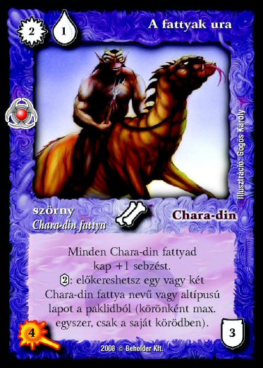 Szöveg: Minden Chara-din fattyad kap +1 sebzést. [2]: előkereshetsz egy vagy két Chara-din fattya nevű vagy altípusú lapot a paklidból (körönként max. egyszer, csak a saját körödben).