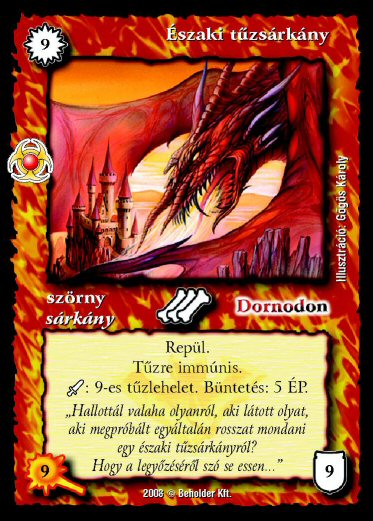Szöveg: Repül. Tűzre immúnis. _+: 9-es tűzlehelet. Büntetés: 5 ÉP.