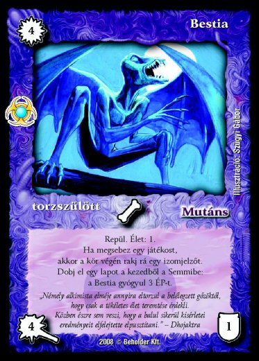 Szöveg: Repül. Élet: 1. Ha megsebez egy játékost, akkor a kör végén rakj rá egy izomjelzőt. Dobj el egy lapot a kezedből a Semmibe: a Bestia gyógyul 3 ÉP-t.